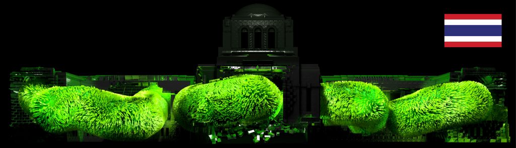 JURY PRIZE(審査員特別賞)はRESORB(ドイツ)が製作した「Mutate / Evolve」という作品で、AIアルゴリズムで生成された生命体が描かれ、それらは突然変異したかの様でありながら、建物と溶け合う様にも設計されていました。技術的にはまだ過渡期の表現であるAI技術を使ったものではありますが、複雑に絡み合う様や透明感のあるビジュアルは命の生々しさ、強さを感じさせ、今の時代を示唆する様でもありました。